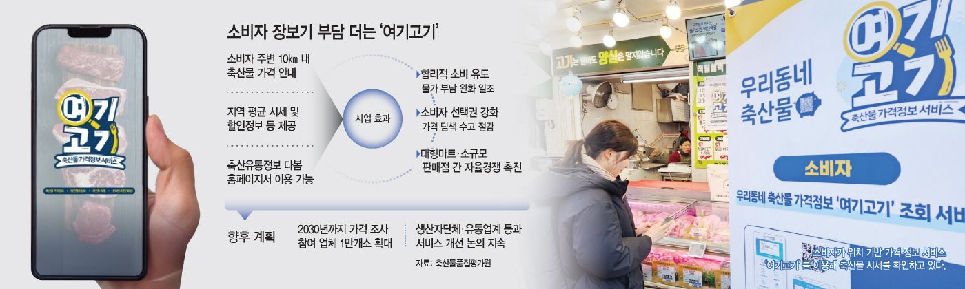 축산물품질평가원이 소비자 주변 축산물 가격을 한눈에 비교할 수 있는 '여기고기' 서비스를 통해 장바구니 부담 완화에 나서고 있다. 향후 서비스 인지도 제고 등을 통해 이용자 접근성을 높여나갈 계획이다. 15일 축평원에 따르면 여기고기는 축산물 판매장별 가격 정보를 소비자 위치에 기반해 제공하는 서비스로 지난 2017년부터 운영 중이다. 이용자 주변 10㎞ 내 매장의 축산물 가격과 지역 평균 시세 비교를 통해 적절한 소비를 돕는 것이 핵심이다. 해당 정보는 정육점에서 자율적으로 등록하거나 '전자식육판매표지판' 시스템과 연계해 자동 수..