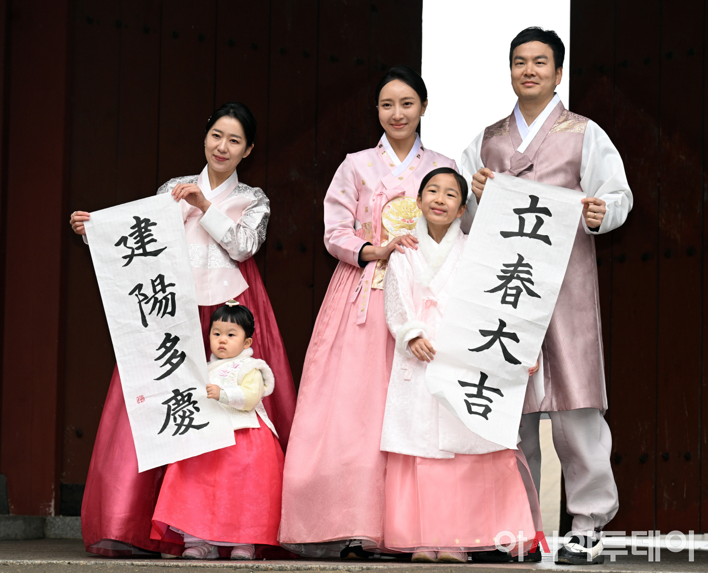 절기상 입춘(入春)인 4일 오전 서울시 중구 남산골한옥마을에서 약 10년 전 전통 혼례와 웨딩 촬영을 진행한 1990년생 말띠 시연자 가족이 입춘첩 부착 행사를 하고 있다.