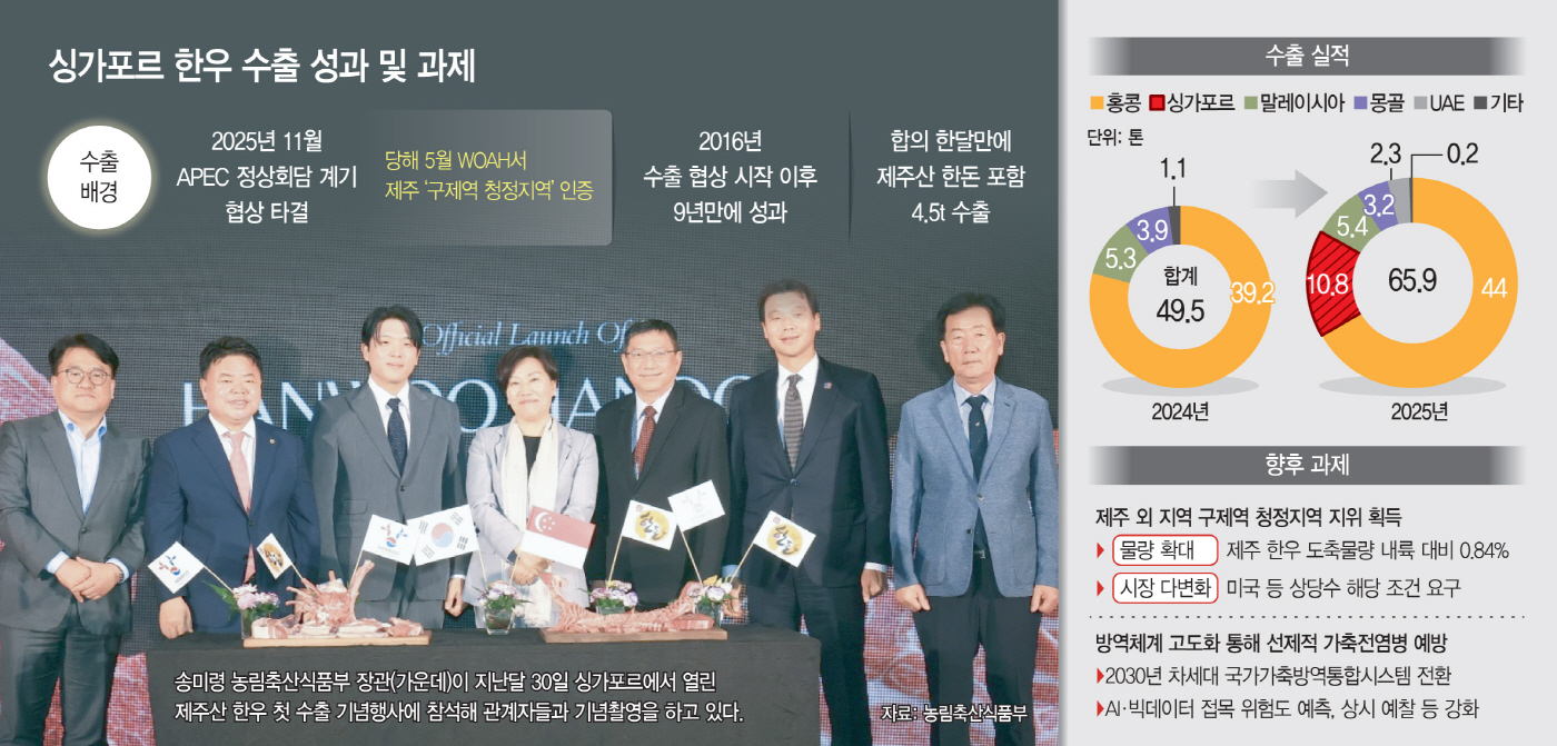 K-축산물의 싱가포르 수출은 지난해 11월 진행된 아시아태평양경제협력체(APEC) 정상회의를 계기로 본격 시작됐다. 앞서 당해 5월 제주도가 세계동물보건기구(WOAH) 총회에서 구제역 청정지역 지위를 획득한 뒤 검역협상은 급물살을 탔다. 2016년 수출 협상을 시작한 지 약 9년만이다.